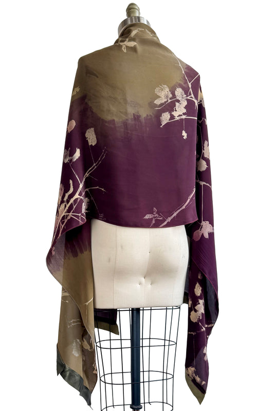 Shawl w/ Leather Trim | Silk Georgette | Branch Print | Olive Green & Eggplant