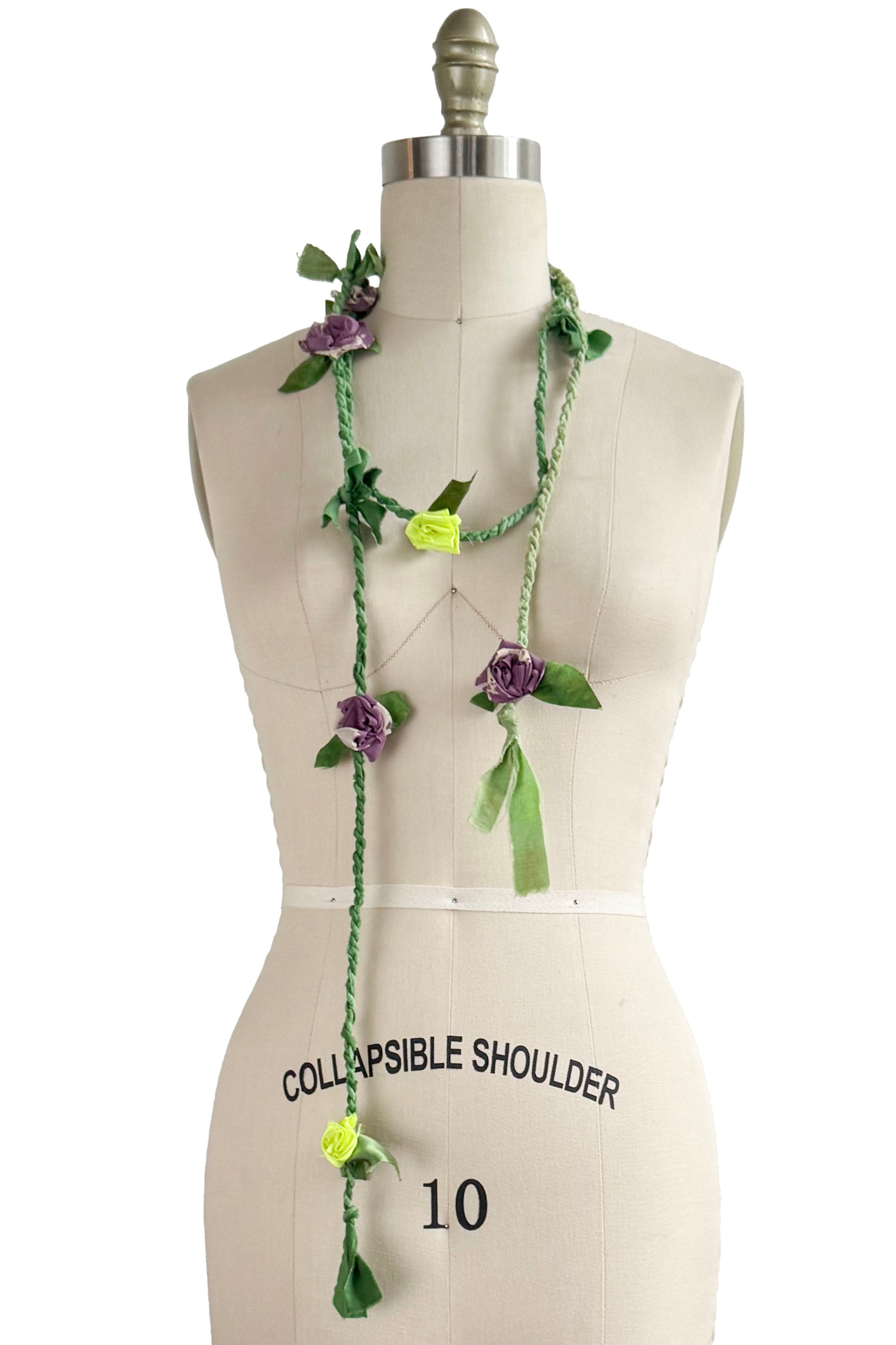Hand Twisted Rope Flower Lariat | Reclaimed Silk | Green & Purple